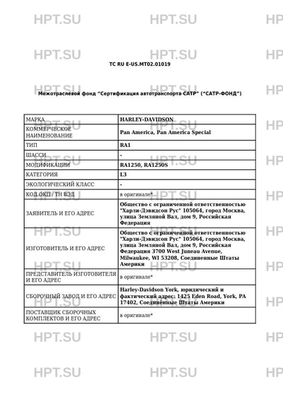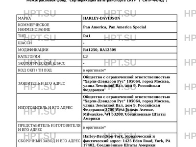 Представитель изготовителя Общество с ограниченной ответственностью "Харли-Дэвидсон Рус". 1105064, город Москва, улица Земляной Вал, дом 9, Российская Федерация. ОГРН: 1107746879547. Тел. (495) 967 97 47. Факс (495) 967 97 47. Представитель в Республике Беларусь: Общество с ограниченной ответственностью "Мегаполисинвест", ОКЮЛП 190572687, юридический и фактический адрес: 220012, город Минск, улица М. Богдановича, дом 120 Б, офис 502, Республика Беларусь, тел.: +375 29 300 00 04, факс: +375 29 300 00 04, электронная почта: e.tverdokhleb@harley-davidson-minsk.by Представитель в Республике Казахстан: ТОО "БИПЭК АВТО Казахстан", БИН 091240008010, юридический и фактический адрес: 070011, город Усть-Каменогорск, пр. Независимости, дом 92/1, Республика Казахстан, тел.: +7 777 735 0005, факс: +7 777 735 0005, электронная почта: info@hd-almaty.kz