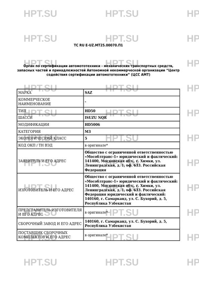 | Номер документа | ТС RU Е-UZ.МТ25.00070.П1 |