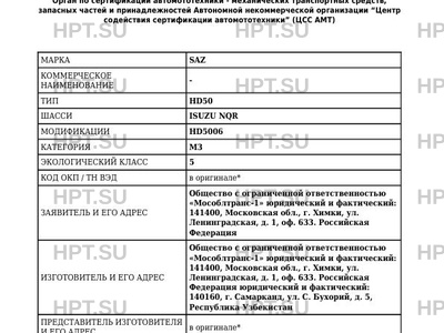 | Тип ТС | Транспортные средства изготавливаются на базе шасси модификаций: 90L-M Транспортные средства относятся к категориям: М3 класс II, М3 класс III Транспортные средства марки SAZ типа HD50 модификации HD5006 относятся к классу II, предназначены для перевозки преимущественно сидящих пассажиров и имеют возможность для перевозки стоящих пассажиров в проходе (абзац пятый пункта 2.2 приложения № 1 к техническому регламенту Таможенного союза «О безопасности колесных транспортных средств»). Транспортные средства марки SAZ типа HD50 модификации HD5006 класса II оборудованы ремнями безопасности и могут быть использованы для перевозки пассажиров в междугородном сообщении. Транспортные средства SAZ типа HD50 модификации HD5006 относятся к классу III и предназначены для перевозки исключительно сидящих пассажиров (абзац пятый пункта 2.2 приложения № 1 к техническому регламенту Таможенного союза «О безопасности колесных транспортных средств»). |