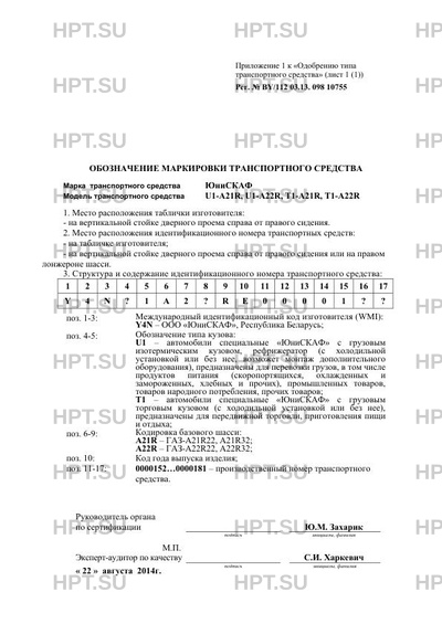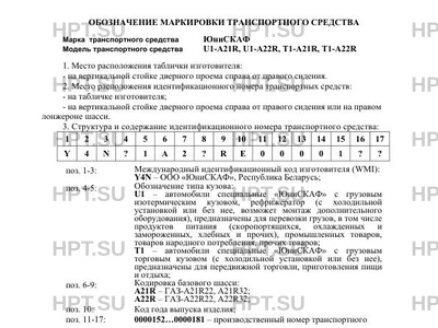 | Исполнение загрузочного пространства | U1-А21R, U1-A22R - автомобили специальные "ЮниСКАФ" с грузовым изотермическим кузовом, рефрижератор (с холодильной установкой или без нее, возможет монтаж дополнительного оборудования), предназначены для перевозки грузов, в том числе продуктов питания (скоропортящихся, охлажденных и замороженных, хлебных и прочих), промышленных товаров, товаров народного потребления, прочих товаров; Т1-A21R, T1-A22R - автомобили специальные "ЮниСКАФ" с грузовым торговым кузовом (с холодильной установкой или без нее), предназначены для передвижной торговли, приготовления пищи и отдыха |