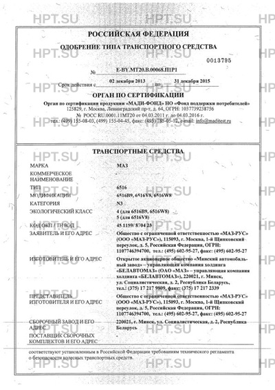 | Заявитель | Общество с ограниченной ответственностью "МАЗ-РУС" (ООО "МАЗ-РУС"), 115093, г. Москва, 1-й Щипковский переулок, д. 5, Российская Федерация, ОГРН: 1107746394700, тел.: (495) 602-95-27, факс: (495) 602-95-27 |
