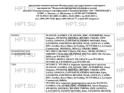 | Коммерческое наименование | WY 150T-3, SB 150T-3 Matrix 150, Fiery, 150 HS, SP150T-3, SHB150T-3,Mobydick 150, PURGA 150, PALADIN 150, Nirvana, RZR (для WY150T-3); WY150-5, SB150-5, GRACE 150, GRACE (для WY150-5); WY150T-44, CENTRINO (для WY150T-44). Тип ТС: WY150T-3, WY150-5 (с марками транспортного средства WANGYE, SANBEN, UM, KENOS, MDC, SUPERBYKE, Street Elegance, 4WMOTO, MISTRAL, RIVERO, VIKERS, ZIPP, SANLI, GOWINN, LANVERTTI, GEMINI MOTORS, Pulse, LEXMOTO, EMFMOTO, BENZER, WLIE, LEEWAY, CAPRI, BTC, GerRoe, Rover Bikes, Q-Trading, TUTTI BELLA, La Souris Commercial, IRBIS); WY150T-44 (с марками транспортного средства WANGYE, SANBEN, UM, KENOS, MDC, SUPERBYKE, Street Elegance, 4WMOTO, MISTRAL, RIVERO, VIKERS, ZIPP, GOWINN, LANVERTTI, GEMINI MOTORS, Pulse, LEXMOTO, BENZER, MONDIAL, RIALLI, VIKERS, IRBIS) |