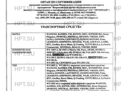 | Тип ТС | WY150T-3 ; WY150-5 (с марками транспортного средства WANGYE ; SANBEN ; UM ; KENOS ; MDC ; SUPERBYKE ; Street Elegance ; 4WMOTO ; MISTRAL ; RIVERO ; VIKERS ; ZIPP ; SANLI ; GOWINN ; LANVERTTI ; GEMINI MOTORS ; Pulse ; LEXMOTO ; EMFMOTO ; BENZER ; WLIE ; LEEWAY ; CAPRI ; BTC ; GerRoe ; Rover Bikes ; Q-Trading ; TUTTI BELLA ; La Souris Commercial ; IRBIS) ; WY150T-44 (с марками транспортного средства WANGYE ; SANBEN ; UM ; KENOS ; MDC ; SUPERBYKE ; Street Elegance ; 4WMOTO ; MISTRAL ; RIVERO ; VIKERS ; ZIPP ; GOWINN ; LANVERTTI ; GEMINI MOTORS ; Pulse ; LEXMOTO ; BENZER ; MONDIAL ; RIALLI ; VIKERS ; IRBIS) |