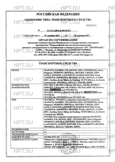 | Коммерческое наименование | WY 150T-3, SB 150T-3 Matrix 150, Fiery, 150 HS, SP150T-3, SHB150T-3,Mobydick 150, PURGA 150, PALADIN 150, Nirvana, RZR, Nirvana 150 (для WY150T-3); WY150-5, SB150-5, GRACE 150, GRACE, GRACE 150-2 (для WY150-5); WY150T-44, CENTRINO (для WY150T-44); WY150T-3, WY150-5 (с марками транспортного средства WANGYE, SANBEN, UM, KENOS, MDC, SUPERBYKE, Street Elegance, 4WMOTO, MISTRAL, RIVERO, VIKERS, ZIPP, SANLI, GOWINN, LANVERTTI, GEMINI MOTORS, Pulse, LEXMOTO, EMFMOTO, BENZER, WLIE, LEEWAY, CAPRI, BTC, GerRoe, Rover Bikes, Q-Trading, TUTTI BELLA, La Souris Commercial, IRBIS); WY150T-44 (с марками транспортного средства WANGYE, SANBEN, UM, KENOS, MDC, SUPERBYKE, Street Elegance, 4WMOTO, MISTRAL, RIVERO, VIKERS, ZIPP, GOWINN, LANVERTTI, GEMINI MOTORS, Pulse, LEXMOTO, BENZER, MONDIAL, RIALLI, VIKERS, IRBIS) |