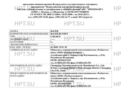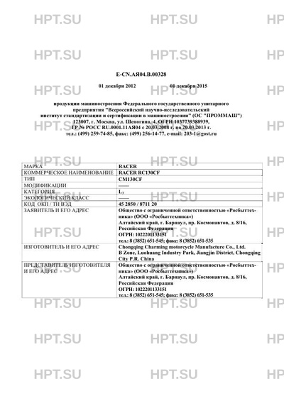 | Коммерческое наименование | RACER RC130CF. Тип ТС: CM130CF |