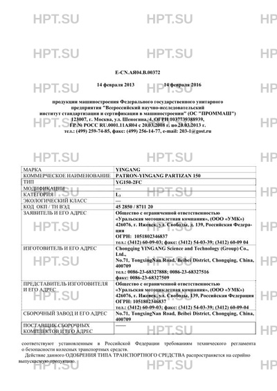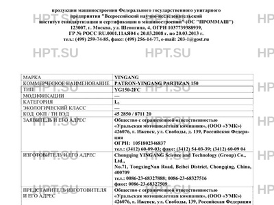 Коммерческое наименование PATRON-YINGANG PARTIZAN 150