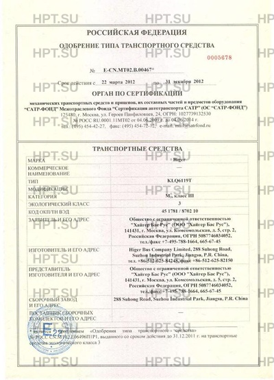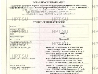 Предприятие-изготовитель Higer Bus Company Limited, 288 Suhong Road, Suzhou Industrial Park, Jiangsu, P.R. China, тел. +86-512-625-84248, факс +86-512-625-82150