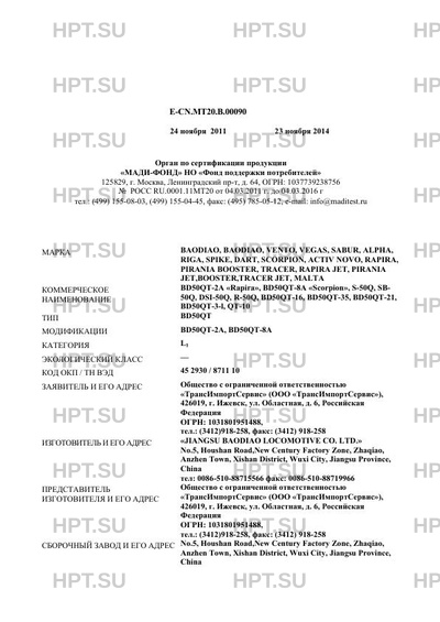 | Марка ТС | BAODIAO, BAODIAO, VENTO, VEGAS, SABUR, ALPHA, RIGA, SPIKE, DART, SCORPION, ACTIV NOVO, RAPIRA, PIRANIA BOOSTER, TRACER, RAPIRA JET, PIRANIA JET,BOOSTER,TRACER JET, MALTA |