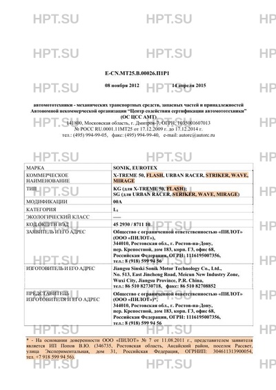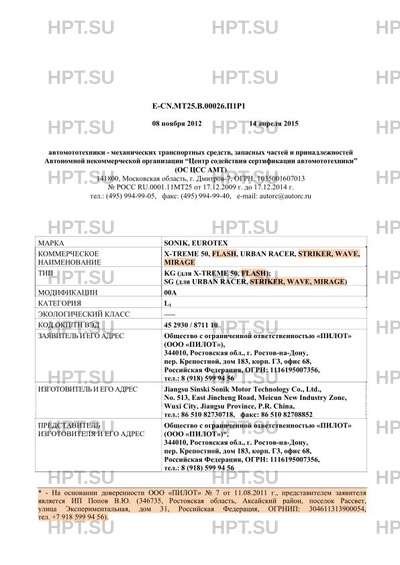 | Коммерческое наименование | X-TREME 50, FLASH, URBAN RACER, STRIKER, WAVE, MIRAGE. Тип ТС: KG (для X-TREME 50, FLASH); SG (для URBAN RACER, STRIKER, WAVE, MIRAGE) |