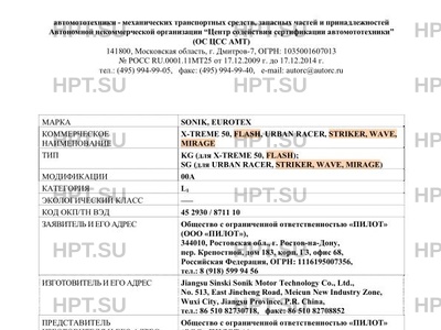 | Тип ТС | KG (для X-TREME 50, FLASH); SG (для URBAN RACER, STRIKER, WAVE, MIRAGE) |