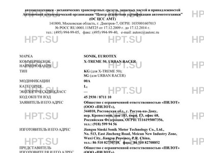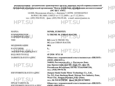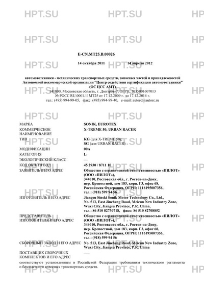 | Тип ТС | KG (для X-TREME 50, FLASH); SG (для URBAN RACER, STRIKER, WAVE, MIRAGE) |