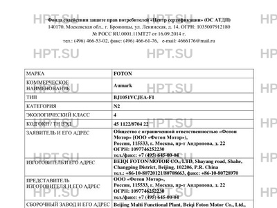 Заявитель Общество с ограниченной ответственностью «Фотон Мотор» (ООО «Фотон Мотор»), Россия, 115533, г. Москва, пр-т Андропова, д. 22 ОГРН: 1097746252230 тел./факс: +7 (495) 645-00-04