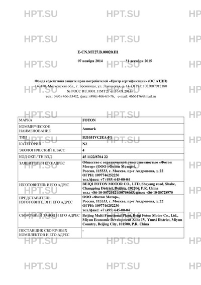 Предприятие-изготовитель BEIQI FOTON MOTOR CO., LTD, Shayang road, Shahe, Changping District, Beijing, 102206, P.R. China тел.: +86-10-80720121/80708663, факс: +86-10-80728970
