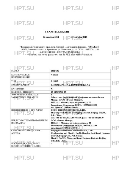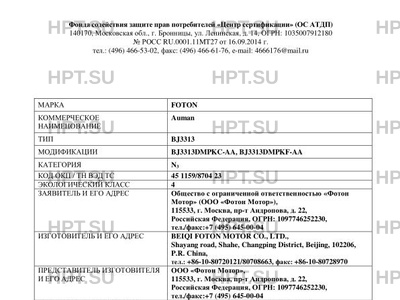 | Заявитель | Общество с ограниченной ответственностью "Фотон Мотор" (ООО "Фотон Мотор"), 115533, г. Москва, пр-т Андропова, д. 22, РоссийскаяФедерация, ОГРН: 1097746252230, тел./факс:+7 (495) 645-00-04 |