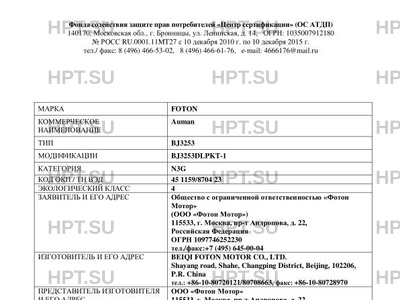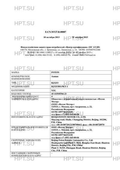 | Представитель изготовителя | ООО "Фотон Мотор" 115533, г. Москва, пр-т Андропова, д. 22, РоссийскаяФедерация ОГРН 1097746252230 тел./факс:+7 (495) 645-00-04 |
