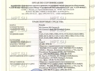 | Заявитель | Общество с ограниченной ответственностью "ПОРШЕ РУССЛАНД" (ООО "ПОРШЕ РУССЛАНД") 125445, г. Москва, Ленинградское шоссе, д. 71А, стр. 10, Российская Федерация ОГРН: 1037703036931, тел.: (495) 980-99-11, факс: (495) 363-19-91 |