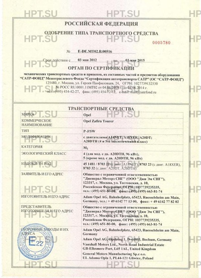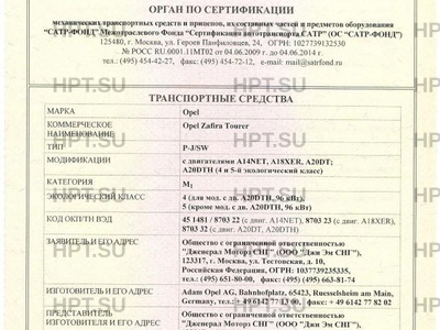 | Коммерческое наименование | Opel Zafira Tourer. Тип ТС: P-J/SW |