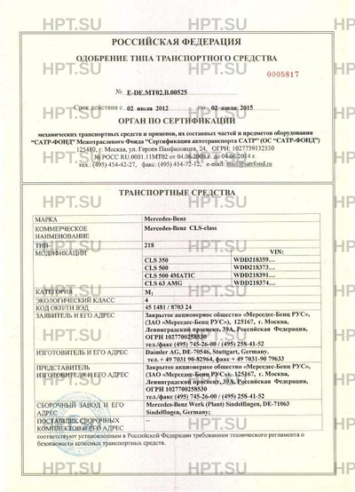 Коммерческое наименование Mercedes-Benz CLS-class. Тип ТС: 218