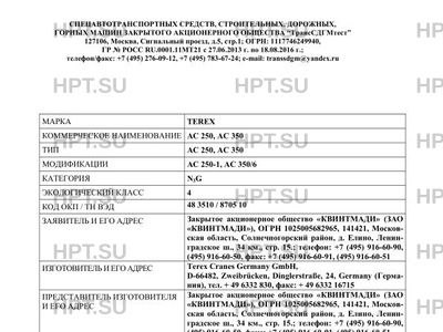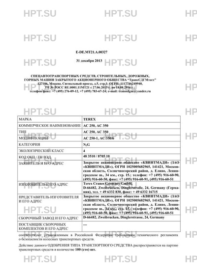 | Предприятие-изготовитель | Terex Cranes Germany GmbH, D-66482, Zweibrücken, Dinglerstraße, 24, Germany (Германия), тел. + 49 6332 830, факс: + 49 6332 16715 |