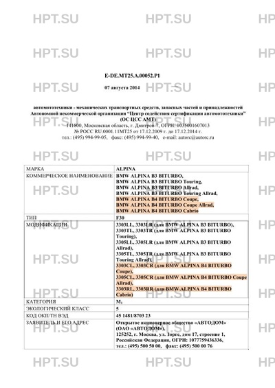 | Коммерческое наименование | BMW ALPINA B3 BITURBO, BMW ALPINA B3 BITURBO Touring, BMW ALPINA B3 BITURBO Allrad, BMW ALPINA B3 BITURBO Touring Allrad, BMW ALPINA B4 BITURBO Coupe, BMW ALPINA B4 BITURBO Coupe Allrad, BMW ALPINA B4 BITURBO Cabrio; F30 |