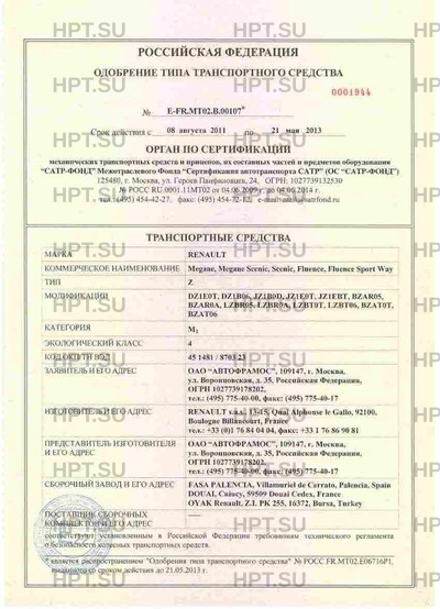 | Тип ТС | Megane, Megane Scenic, Scenic, Fluence, Fluence Sport Way |