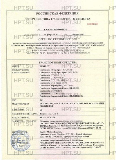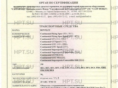 | Коммерческое наименование | Continental Flying Spur (BE4, BE5), Continental Flying Spur Speed (BF4, BF5), Continental GT (CE4, FH4), Continental GT Speed (CF4), Continental GTC (DE4, GH4), Continental GTC Speed (DF4), Continental Supersports (CG2, CG4), Continental Supersports Convertible (DG4), Continental GT V8 (FJ4), Continental GTC V8 (GJ4), Continental Supersports Convertible ISR (DL4). Тип ТС: 3W |