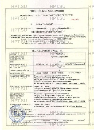 Коммерческое наименование Jaguar XF, Jaguar XFR. Тип ТС: СС9