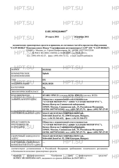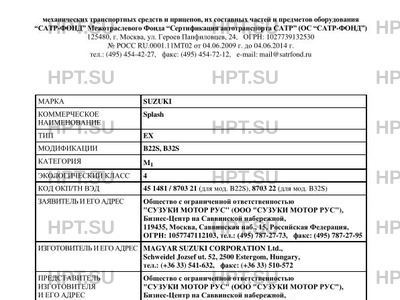 Заявитель Общество с ограниченной ответственностью "СУЗУКИ МОТОР РУС" (ООО "СУЗУКИ МОТОР РУС"), Бизнес-Центр на Саввинской набережной, 119435, Москва, Саввинская наб., 15, Российская Федерация, ОГРН: 1057747112103, тел.: (495) 787-27-73, факс: (495) 787-27-95