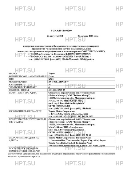 | Представитель изготовителя | Общество с ограниченной ответственностью "Тойота Мотор" (ООО "Тойота Мотор") 141031, Московская обл., Мытищинский р-н, МКАД, 84-км, ТПЗ "Алтуфьево", вл.5, стр.1, Российская Федерация ОГРН 1027739386400 тел.: (495) 258-34-65, факс: (495) 258-34-66 |