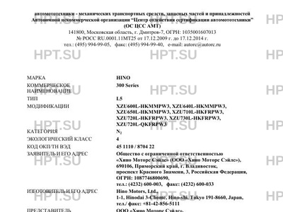 Представитель изготовителя ООО "Хино Моторс Сэйлс", 690106, Приморский край, г. Владивосток, проспект Красного Знамени, 3, Российская Федерация, ОГРН: 1087746800690, тел.: (4232) 600-003, факс: (4232) 600-033