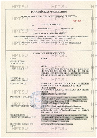 | Предприятие-изготовитель | «BODEX» Spolka z ograniczona odpowiedzialnoscia «SPOLKA KOMANDYTOWA» (BODEX Sp.z o.o.-SK), ul. Raclawicka 13, 53-149, Wroclaw, Польша, тел.: +48 44 631 8281, факс: +48 44631 9031 |