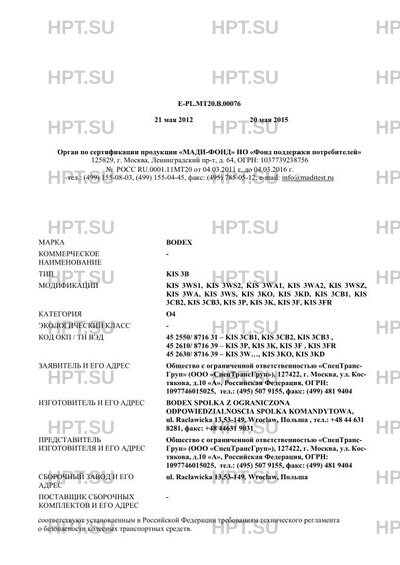 | Дополнительная информация | Транспортные средства BODEX , KIS 3KO, KIS 3KD предназначены для перевозки контейнеров, транспортные средства BODEX , KIS 3WA, KIS 3WS, KIS 3WS1, KIS 3WS2, KIS 3WA1, KIS 3WА2, KIS 3WSZ предназначены для перевозки сыпучих грузов(KIS 3WSZ – металлолома) , транспортное средство BODEX , KIS 3СВ1 предназначено для перевозки непищевых жидкостей, транспортные средства BODEX , KIS 3СВ2 и KIS 3СВ3 предназначены для перевозки опасных грузов классов 3 и 9 соответственно, транспортные средства BODEX , KIS 3P, KIS 3K, KIS 3F предназначены для перевозки грузов общего назначения. |