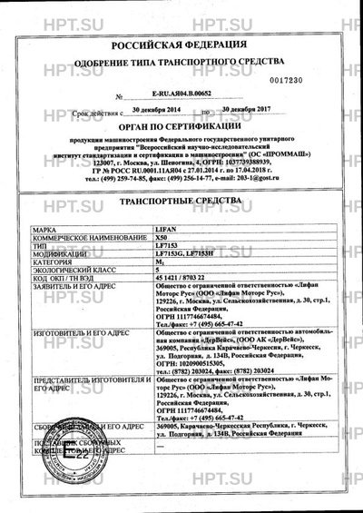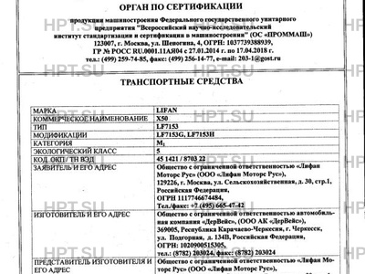 | Представитель изготовителя | Общество с ограниченной ответственностью «Лифан Моторс Рус» (ООО «Лифан Моторс Рус») |