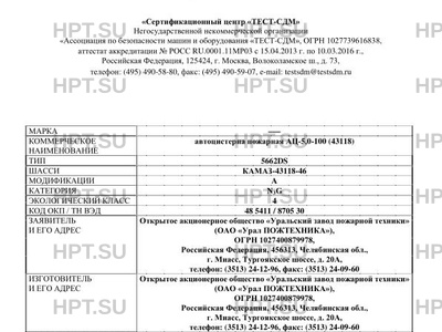 | Предприятие-изготовитель | Открытое акционерное общество «Уральский завод пожарной техники» (ОАО «Урал ПОЖТЕХНИКА»), ОГРН 1027400879978; Российская Федерация, 456313, Челябинская обл., г. Миасс, Тургоякское шоссе, д. 20А |