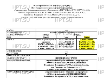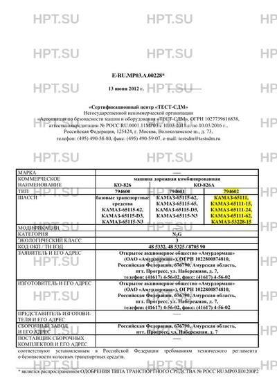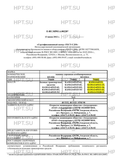 | Коммерческое наименование | машина дорожная комбинированная КО-826, КО-826А. Тип ТС: 794600, 794601, 794602 |