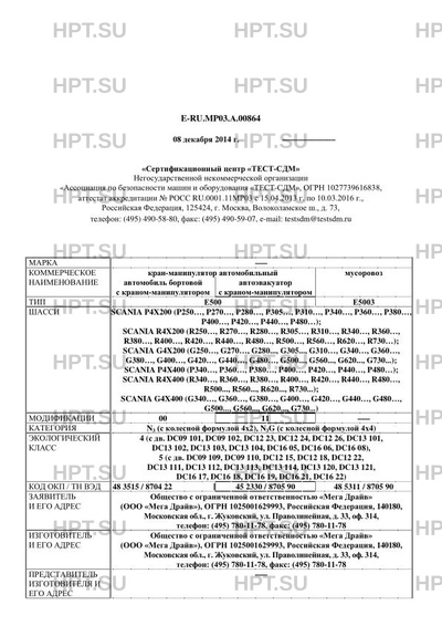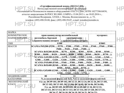 | Оборудование ТС | климат-контроль или кондиционер (хладагент R134a или R404а); - устройства освещения рабочей зоны; - проблесковый маячок оранжевого цвета (для Е500 в модификации 11); - дополнительная балка аутригеров (входят в комплект краноманипуляторной установки) * Обозначения по спецификации SCANIA. |
