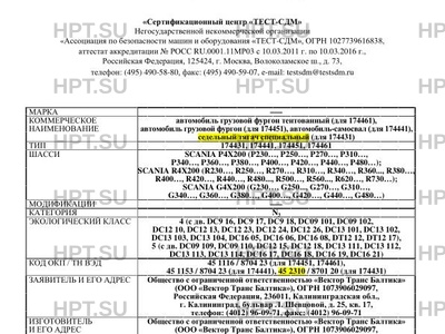 | Оборудование ТС | устройства освещения воза (для 174431); - R134a R404) кондиционер (хладагент или а * Через дробь указаны параметры средства: с ведущей ос для транспортного рессорной подвеской и в составе с двухосным п пневматической подвеской ведущей ос в составе с двухосным рицепом (полуприцепом) / с и прицепом (полуприцепом) с максимальной осевой нагрузкой не более / в составе с трехосным 10000 кг или четырехосным прицепом (полуприцепом). * . Обозначения по спецификации SCANIA |