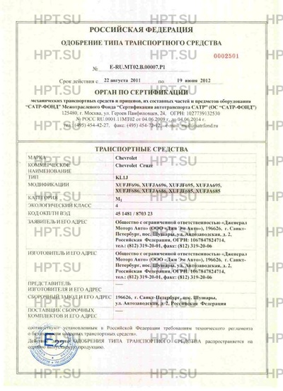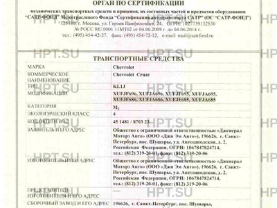 | Коммерческое наименование | Сhevrolet Cruze. Тип ТС: KL1J |