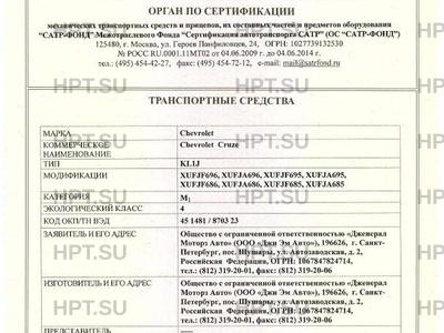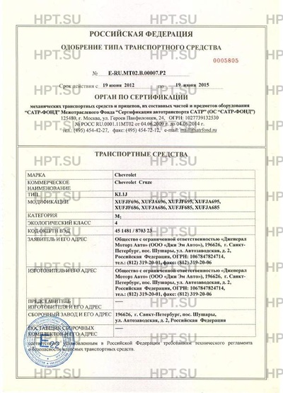| Коммерческое наименование | Сhevrolet Cruze. Тип ТС: KL1J |