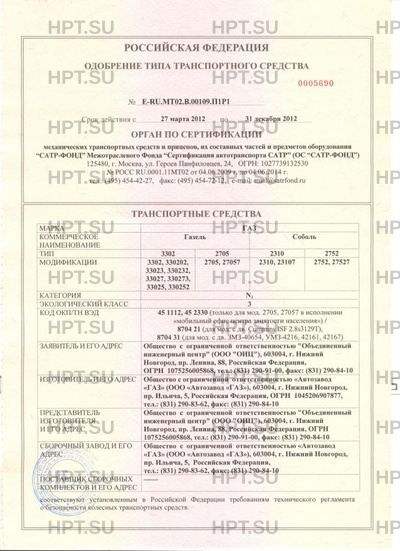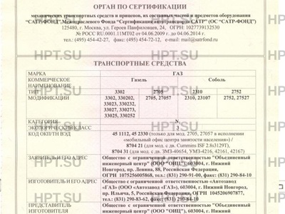 | Коммерческое наименование | Газель , Соболь. Тип ТС: 3302, 2705 , 2310 , 2752 |
