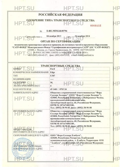 | Заявитель | Общество с ограниченной ответственностью "Форд Соллерс Холдинг" (ООО "Форд Соллерс Холдинг"), 423800, Республика Татарстан, г. Набережные Челны, промышленно-коммунальная зона, Автосборочный проезд, 60, Российская Федерация, ОГРН № 1071674002180, Тел.: (8552) 38-90-83, факс: (8552) 38-90-00 |