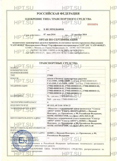 | Заявитель | Общество с ограниченной ответственностью "Спектр-АВТО" (ООО "Спектр-АВТО"), 603069, г. Нижний Новгород, ул. Ореховская, д. 80, Российская Федерация, ОГРН: 1025202272930, тел./факс: (831) 269-21-40 |
