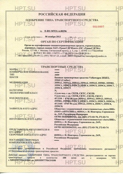 | Базовое ТС / Шасси | базовые транспортные средства Volkswagen 2EKE2, 2EKZ (Crafter) |