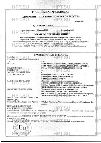| Базовое ТС / Шасси | ISUZU NPR75L-K (для 27801A, 27801B, 27801M, 27801G) ISUZU NPR75L-L (для 27801C… |