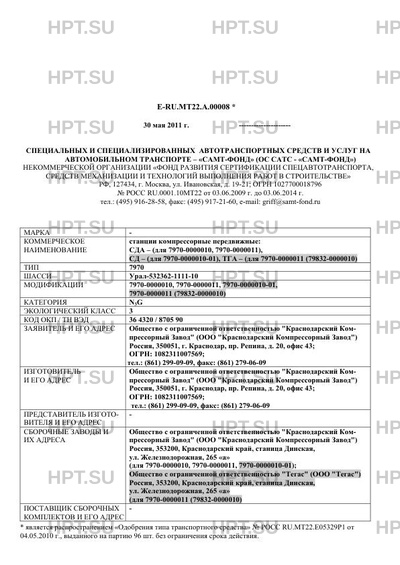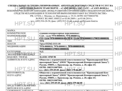 | Коммерческое наименование | станции компрессорные передвижные: СДА – (для 7970-0000010, 7970-0000011), СД – (для 7970-0000010-01), ТГА – (для 7970-0000011 (79832-0000010). Тип ТС: 7970 |