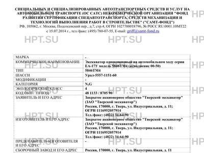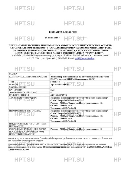 | Коммерческое наименование | Экскаватор одноковшовый на автомобильном ходу серии ЕА-17У модель 5846ТМ4 (исполнение 00-50); 5846ТМ4 |