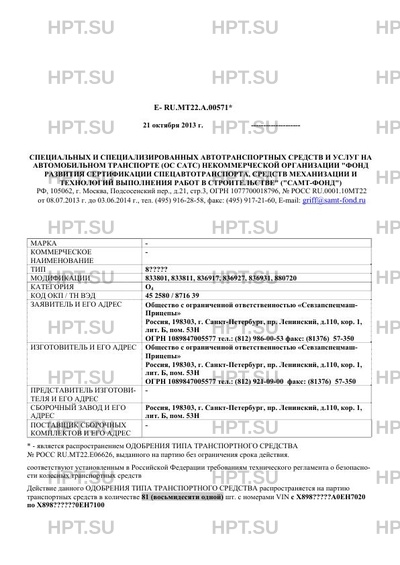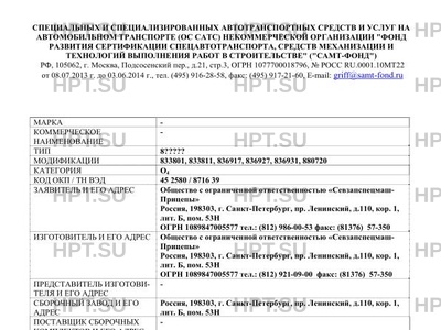 | Заявитель | Общество с ограниченной ответственностью «Севзапспецмаш-Прицепы» Россия, 198303, г. Санкт-Петербург, пр. Ленинский, д.110, кор. 1, лит. Б, пом. 53Н ОГРН 1089847005577 тел.: (812) 986-00-53 факс: (81376) 57-350 |
