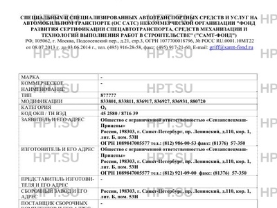 | Дополнительная информация | Назначение транспортных средств:; 833801, 833811, 836917, 836927, 836931 – для перевозки строительной и дорожной техники, негабаритных грузов;; 880720 – для перевозки кабельных барабанов.; В связи с несоответствием параметров транспортных средств значениям, установленным в п.п. 1.1, 1.2, 3.1, 3.2 Приложения № 4 к техническому регламенту о безопасности колесных транспортных средств, для передвижения транспортных средств по территории Российской Федерации необходимо оформление специального разрешения.; Транспортные средства не используются для перевозки опасных грузов. |