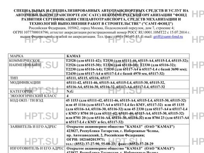| Дополнительная информация | Назначение транспортного средства:; для перевозки грузов различного назначения, кроме опасных грузов (для 65117-А4, 65117-L4, 65117-32);; для буксировки полуприцепа (для 65116-А4, 65116-30, 65116-32); ; для транспортировки сыпучих и навалочных грузов (для 65111-42, 65111-46, 65115-А4, 65115-L4, 65115-30, 65115-32).; ; Перевод буквенно-цифрового обозначения модификаций транспортных средств в вариант обозначения для формализованного (цифрового) кода продукции в процессе производства и отгрузки в соответствии с системой SAP (System Analysis and Program Development) указан в таблице ниже.; ; Буквенно-цифровое обозначение модификаций транспортных средствВариант обозначения модификаций транспортных средств в виде формализованного (цифрового) кода; 65115-A465115-23 (в том числе для поставок в МВД РФ: Автомобиль-самосвал КАМАЗ 65115-0006056-23); 65115-L465115-19; 65116-A465116-23; 65117-A465117-23 (в том числе для поставок в МВД РФ: Автомобиль-тягач грузовой КАМАЗ 65117-0006052-23; Автомобиль-тягач грузовой КАМАЗ 65117-0005001-23 с КМУ); 65117-L465117-19 |