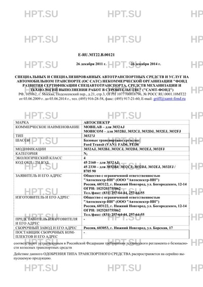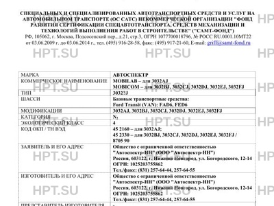 | Назначение | транспортных средств: автомобиль передвижная лаборатория (АЛ) (в том числе для полиции, ВАИ, МЧС), предназначен для проведения измерений -3032AJ; автомобиль "Аварийно-спасательный" (АСМ), предназначен для доставки к месту аварии и проведения аварийно-спасательных работ, а так же для доставки газоспасательного подразделения и необходимого оборудования к месту ликвидации аварии на территории производственного объекта, оказания первой помощи пострадавшим - 3032BJ; автомобиль "Газоспасательный" (ГСА), предназначен для доставки газоспасательного подразделения и необходимого оборудования к месту ликвидации аварий на территории производственного объекта, оказания первой помощи пострадавшим - 3032CJ; автомобиль штабной (АШ) (в том числе для полиции, ВАИ, МЧС), предназначен для организации оперативной работы комиссии (штаба) в городских и полевых условиях как при штатных, так и при возникновении чрезвычайных ситуаций, доставки экипажа и оборудования, управления аварийно-спасательными и другими работами - 3032DJ; автомобиль "Оперативный" (в том числе для полиции, ВАИ, МЧС), предназначен для оперативного реагирования на нештатную ситуацию, доставки экипажа и оборудования - 3032EJ; автомобиль для перевозки опасных грузов (АДПОГ), предназначен для перевозки радиоактивных отходов, радиоактивных материалов, спецодежды и средств индивидуальной защиты (транспортное средство класса 7 по классификации ДОПОГ) - 3032FJ. |